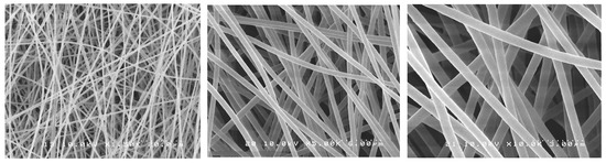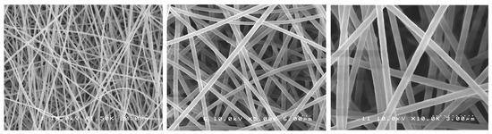 The nanofibers’ morphological characteristics were initially observed under an optical microscope during the electrospinning process (Nikon Eclipse LV100 Optical Microscope, Tokyo, Japan). Samples were collected on a glass slide placed next to the revolving drum to confirm the production of the fibers. A scanning electron microscope (SEM S-238ON, Hitachi, Tokyo, Japan) was used to evaluate the final electrospun mats with an acceleration voltage of 10 kV. The mats were analyzed to evaluate the structure of the fibers. Randomly selected areas of each mat were cut into 5 × 5 mm squares and mounted on stubs with carbon tape (n = 3). The stubs were then coated with platinum/palladium (Pt/Pd) with an ion sputter coater (Hitachi E-1030 Ion Sputter Coater, Hitachi, Tokyo, Japan). Random images were taken from the selected pieces of each mat. Average fiber diameter was calculated based on 15 random measurements from pictures taken at the same magnification, using image software (ImageJ version 1.54, NIH, Stapelton, NY, USA).