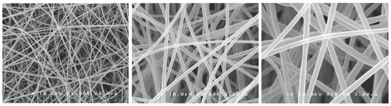 One-way ANOVA analysis showed that the different formulations of the fibers produced did not result in different fiber diameters (p > 0.05). Figure 1, Figure 2, Figure 3, Figure 4 and Figure 5 show nanofibers from the five experimental groups under three magnifications each.