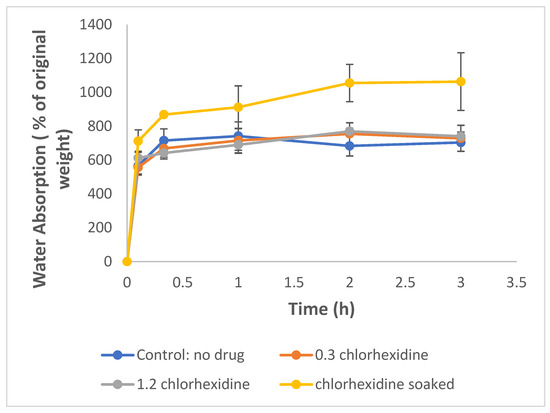 Water absorption of chlorhexidine-loaded cellulose acetate nanofiber mats (0.3 and 1.2 indicate the loading % of chlorhexidine in cellulose acetate).