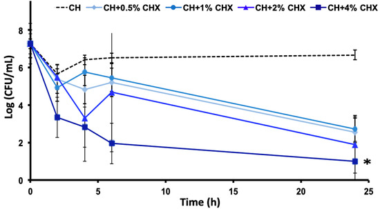 Time–kill kinetics curves and areas under the curves (AUC) of the time–kill kinetics for the CH + 0.5%, 1%, 2%, and 4% CHX solutions (*): significant difference (p < 0.05) between the CH formulation and the test formulations (ANOVA test).