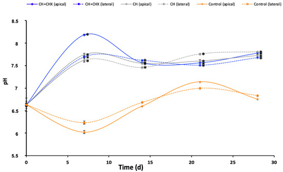 pH changes over 28 days in the diffusion medium of teeth not containing (control) or containing an intracanal medication (calcium hydroxide alone [CH] or CH + 1% chlorhexidine [CH + CHX]) through the apex (apical) or the dental tubuli (lateral). There was a significant difference (*) (p < 0.05) at all times between the control and the test formulations (CH and CH + CHX) (ANOVA test).