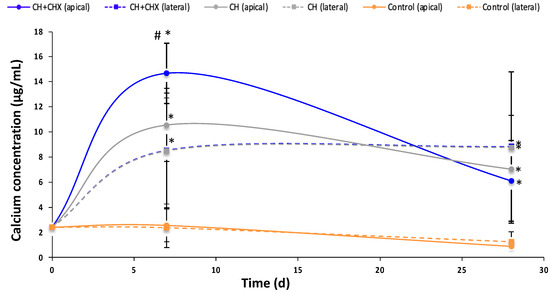 The release of Ca2+ ions was higher at day 7 in the apical group than in the lateral group (Figure 3). The addition of CHX tended to increase the release of Ca2+ ions at day 7 only. At days 7 and 28, more Ca2+ ions were released when CH− or CH + CHX-obturated teeth were immersed in the medium compared to non-obturated teeth (p = 4.66 × 10−12 at day 7; p = 3.90 × 10−5 at day 28).