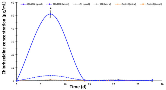 On day 7 (Figure 4), a large amount of CHX was released through the apex of teeth filled with CH + CHX (51.28 μg/mL) and a much lower amount via the lateral route (3.99 μg/mL). No CHX release could be detected for all the other conditions and time points (<0.7 μg/mL (below the limits of quantification)).