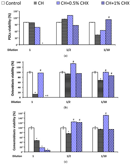 Proliferation of (a) periodontal ligament fibroblasts (PDLs), (b) osteoblasts, and (c) cementoblasts after a 1-day contact with 1, 1/2 or 1/10 diluted calcium hydroxide extracts with (CH + 0.5% CHX and CH + 1% CHX) or without chlorhexidine (CH) (n = 3). The measurements were determined using an Alamar Blue® assay, and the data are expressed as means and standard deviations. Difference between metabolically inactive and metabolically active cells. Standard deviation: 95% confidence interval; (*) significant difference with control group (p < 0.05); (#) significant difference with CH (p < 0.05), (α) significant difference with 0.5% CHX group (p < 0.05) (ANOVA test).