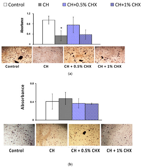 The CH + CHX extracts (CH + 0.5% CHX and CH + 1% CHX) had no effect on the late mineralization of osteoblasts (Figure 7a). A significant reduction in the number of bone-like nodules was observed in the CH group compared to the controls (0.33 pg/mL and 0.95 pg/mL, respectively, p = 0.024).