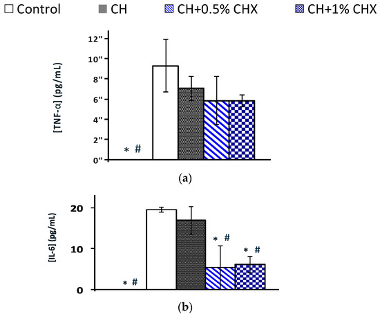 CH + CHX extracts reduced TNF-α (Figure 8a) and IL-6 (Figure 8b) levels in the culture medium of PDLs stimulated with P. gingivalis LPS compared to CH alone or the control. The difference was significant for IL-6 (19.84 pg/mL, 16.89 pg/mL, and 5.33 to 6.08 pg/mL, respectively, for the control, CH alone, and CH + CHX). (p = 0.007) (Figure 8b).