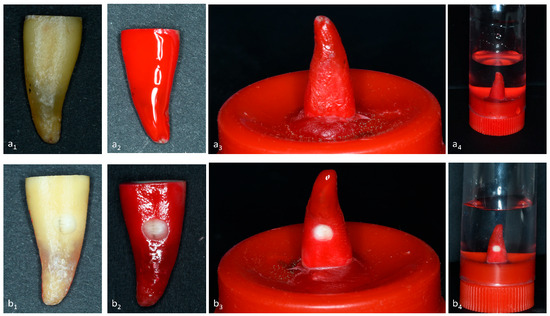 Diffusion model protocol with an incisor (IC) following chemo-mechanical preparation: (a1,b1) labio-lingual views, (a1) for apical diffusion and (b1) for lateral diffusion following the cavity preparation, (a2,b2), following the varnish application, (a3,b3) root attachment to the vial cap, and (a4,b4) immersion in 10 mL of deionized water and incubation at 37 °C in a humidified atmosphere.