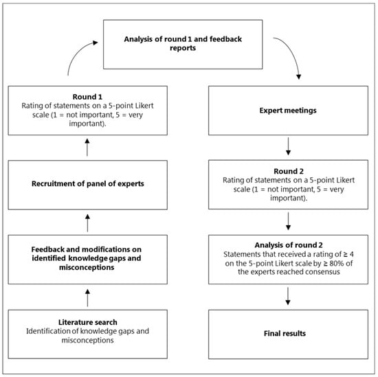 The study adopted a modified Delphi technique to reach consensus [17,18,19,20]. This Delphi study was modified in the form of an email survey with expert online meetings in between the two rounds, and the typical “idea generation” first round was replaced with a literature search (Figure 1).
