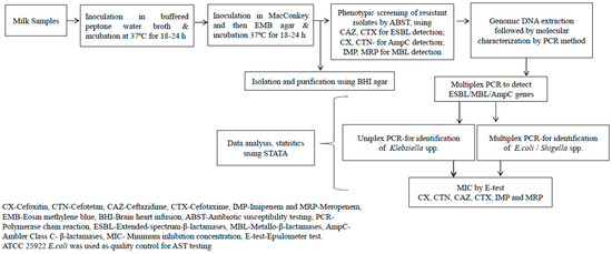 The samples were processed by inoculating in buffered peptone water (Hi-media, Maharashtra, India) and incubated at 37 °C for 18–24 h to grow presumptive GNB. The culture broth was inoculated on MacConkey agar plates (Hi-media, Maharashtra, India) and incubated at 37 °C for 18–24 h to grow presumptive E. coli, Shigella spp. and Klebsiella spp. Suspected E. coli were further inoculated in Eosin Methylene Blue (EMB) agar (Hi-media, Maharashtra, India) for differential detection. Brain heart infusion agar (Hi-media, Maharashtra, India) was used for subculturing and purification. The colonies were initially identified based on colony morphology, Gram staining and biochemical tests. If morphologically distinct colonies were present from a single sample, they were considered as separate isolates for further analysis, meaning that there were more isolates than original samples according to the schematic represented in Figure 2.