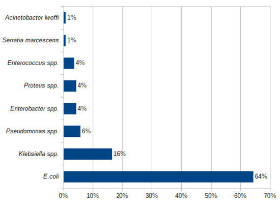 The most common causative agent was E. coli, responsible for 64.29% of UTIs in the whole study group. Among non-E. coli UTIs, the dominating causative bacteria were Klebsiella spp. (16.43%), followed by Pseudomonas spp., Enterobacter spp., Proteus spp., and Enterococcus spp. The prevalence of uropathogens identified in all analyzed urine cultures is presented in Figure 1.