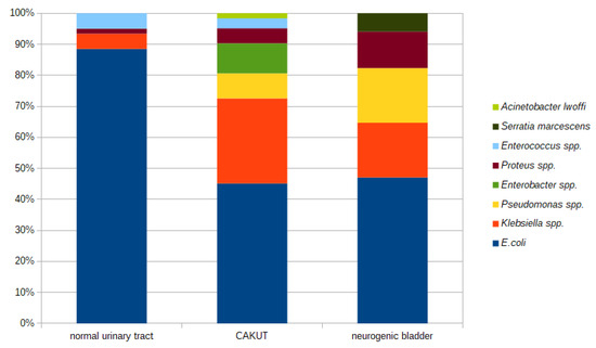 The prevalence of different etiologic factors for a UTI differed in children with CAKUT or a neurogenic bladder and children without diagnosed abnormalities in the urinary tract (Figure 2).
