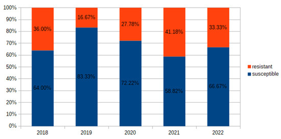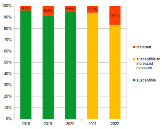 During 2018–2022, we observed that the prevalence of E. coli resistant to amoxicillin/clavulanic acid varied from 16.67% to 41.18% (Figure 3). The prevalence of resistance of E. coli to cefuroxime increased four times in the analyzed period (from 4% to 16.67%). Also, starting in 2021, all isolated E. coli strains were classified as either susceptible-increased exposure or resistant to cefuroxime (Figure 4).