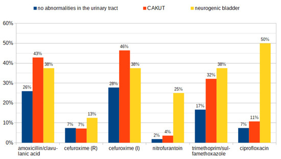 Resistance patterns of E. coli isolated from patients without abnormalities in the urinary tract, in children with CAKUT, and with a neurogenic bladder. R—resistant; I—susceptible-increased exposure.