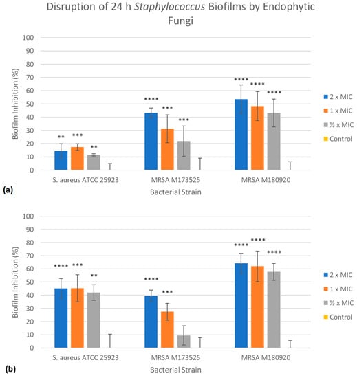 Statistical analysis was carried out using Microsoft Excel (t-test) to determine the ability of EtOAc extracts of two endophytic fungi to inhibit the biofilm formation and disrupt established biofilms of S. aureus and MRSA. All data are presented as the mean of all replicates, with error bars representing the SD. A p-value equal to or less than 0.05 was considered statistically significant.