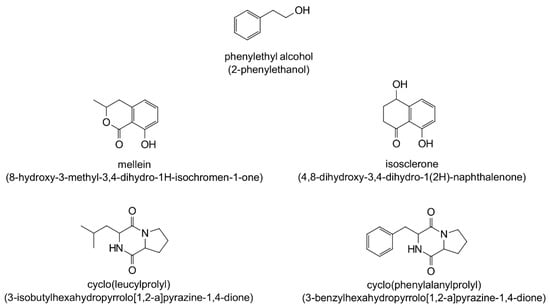 The EtOAc extract of EL 24 was selected for analysis by gas chromatography–mass spectrometry (GC-MS) to identify chemical constituents. The total ion chromatogram (TIC; Figure 4) of EL 24 shows numerous peaks, of which five were tentatively identified based on their match to compounds listed in the National Institute of Standards and Technology (NIST) Mass Spectral Library and Wiley Registry. The largest peak, with a retention time of 26.21 min, could not be identified in this case. Of the compounds that were identified in the extract, phenylethyl alcohol (RT = 9.47 min) was the most abundant, representing 12% of the total peak area, while other compounds, including mellein (RT = 15.71 min), isosclerone (RT = 16.64 min), cyclo(leucylprolyl) (RT = 19.15 min), and cyclo(phenylalanylprolyl) (RT = 23.40 min), were also detected in smaller amounts, each with peak areas less than 5%. These results are summarised in Table 3, while their chemical structures are shown in Figure 5.