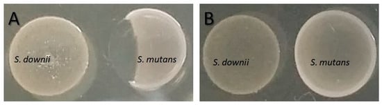 To determine whether bacteriocins might be responsible for the inhibition by S. downii, after incubation in a solid medium for 24 h, 10 μL of proteinase K (70 μg/mL; Sigma, St. Louis, MO, USA) was added to one side of the colony, and 10 μL of PBS was added to the other. Subsequently, 5 μL of S. mutans ATCC 25175T was inoculated to the right and left sides, as reported previously by other authors [6,18]. Mutacin-producing S. mutans ATCC 25175T [6] was used as a positive control, and S. sanguinis DMSZ 20567T was used as a negative control. The plates were visualized after incubation at 37 °C for 24 h, and the absence of haloes indicated that inhibition was caused by molecules of a peptide-type nature.