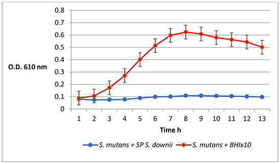 Growth curves of S. mutans in the presence of concentrated S. downii supernatant (SP S. downii) and concentrated BHI medium (BHI × 10). The addition of the concentrated S. downii supernatant inhibits the growth of S. mutans (blue line), while S. mutans preserves its growth capacity after the addition of the concentrated BHI medium (red line). Mean and standard deviation of three replicates.