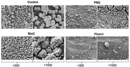 Representative scanning electron microscopy images of S. mutans biofilms formed on each specimen after a 24 h incubation. An extremely small number of biofilm clusters were observed on the surface in the FluorJ group. A large number of mature biofilm clusters covered the surface throughout the field of view of the Control, PRG, and BioCoat groups, respectively. Scale bars = 100 μm (×300) and 20 μm (×1000).