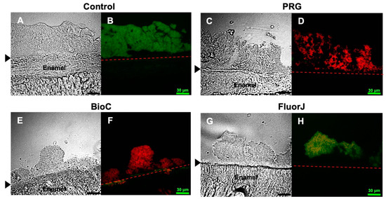 Representative cryosectioned images of S. mutans biofilms using Live/Dead® staining. Live cells are stained green (SYTO9) and dead cells are stained red (propidium iodide). (A,C,E,G) Transmission images; (B,D,F,H) fluorescent images. Black arrow and dash line: interface between enamel surface and biofilm. Scale bar = 30 μm.