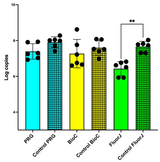 The counts of total bacterial cells in all experimental groups were relatively lower than those in their corresponding control groups; however, FluorJ was the only group showing a significant difference (p < 0.01), revealing 6.43 ± 0.40 for the FluorJ group and 7.66 ± 0.30 log copies for the corresponding control (Figure 4). FluorJ was the only material that inhibited biofilm accumulation and had a bactericidal effect.