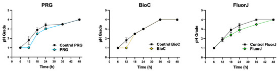 Changes to acid production by biofilm on specimens over 48 h. The pH scoring was ascertained after a predetermined incubation period using a modified 7-scale grading system with a 0.5 interval grade based on a 4-scale system. pH grade 0 had low acidity and grade 5 had high acid-production rates. There was no significant difference between the experimental and the corresponding control group among all test materials.