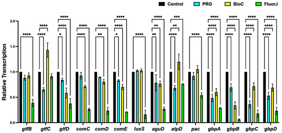 The expression profiles of the genes assumed to participate in biofilm formation (gtfB, gtfC, gtfD, comC, comD, comE, and luxS), bacterial adherence (pac, gbpA, gbpB, gbpC, and gbpD), acid tolerance (aguD), and acid production (atpD) are summarized in Figure 7. S. mutans that developed in the FluorJ group showed a significant downregulation in the transcription of all genes compared with the control, except for gtfC. The BioC group showed a significant decrease in gene transcription, except for gtfB, gtfC, luxS, atpD, and pac; however, the decrease was smaller than that in the FluorJ group. The transcription of gtfC, gtfD, comE, aguD, atpD, and the four gbp genes in the PRG group was significantly downregulated compared with the control group; however, the ratio of downregulation was smaller than that in the FluorJ group.