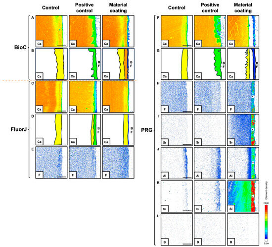 Calcium (Ca), fluorine (F), strontium (Sr), aluminum (Al), silica (Si), and boron (B) ion incorporations into the demineralized bovine enamel after applying BioC (A,B), FluorJ (C–E), and PRG (F–L). Control: no application of coating material. Positive control: biofilm formation without a coating material. Material coating: biofilm formation following application with either coating material. (B,D,G) Illustrations of demineralized areas and Ca ion incorporation; yellow color: experimentally demineralized area using demineralizing solution; green color: demineralized area showing acid production from biofilm; orange color: remineralized area using released Ca ions from coating materials. BF: biofilm. Asterisk (*): PRG. Scale bar = 50 μm.
