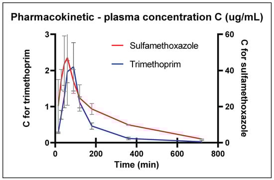 The pharmacokinetic curve showing the dependence of plasma concentration on sampling time points (mean ± SD). Y axis on the left—trimethoprim concentration in the range of 0 to 3 μg mL−1; Y axis on the right—sulfamethoxazole concentration in the range of 0 to 60 μg mL−1.