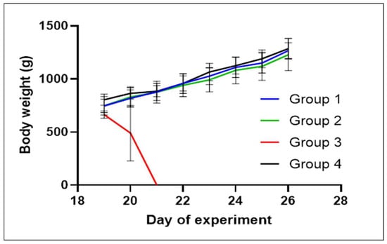 Based on the proposed dosing determined by PK parameters, the efficacy of the newly proposed dosage of these substances in an altered 4:1 ratio was verified in broilers experimentally infected with E. coli. The notable difference in survival outcomes between the groups treated with experimental and traditional dosing compared to the untreated group reinforces the potential of the drug combination in mitigating the adverse effects of E. coli infection. The results of this experiment demonstrated the statistically significant efficacy of the experimental treatment when compared to the untreated group. The potency of the experimental treatment was comparable to that of the conventional treatment, as demonstrated by the survival curves in Figure 4. Furthermore, the experimental treatment of broilers in the early fattening stage did not adversely affect their weight gain, average daily gain or feed conversion. Statistically, the t-test showed no significant difference (p-value = 0.156) in live weight and AGD (p-value = 0.239) between group 3 (experimentally infected and untreated) and group 1 (experimentally treated) at the beginning and end of the experiment. The changes in broiler weight during the experiment are shown in Figure 2 and Figure 3. Even though the group treated with the experimentally proposed dosing ratio is a relatively small sample for extensive statistical evaluation, the probability of survival was slightly higher (10%) in the group treated with the experimentally proposed dosing ratio than in the group treated with the traditional dosing ratio. The chickens in groups 1 and 2 were treated at three per os doses at 24 h intervals as proposed by the EMA [], where the recommended treatment period for broilers, which is usually 3 to 4 days for registered poultry veterinary medicines containing trimethoprim and sulfamethoxazole. This is also described in [], where the recommended treatment period is usually 3 days, i.e., until the mortality in breeding ceases and the animals do not show clinical symptoms. Moreover, the authors describe that, although the mortality of individuals may continue to increase at the beginning of treatment, these are probably very sick individuals who are not able to receive a sufficient dose of the drug necessary for effective treatment.