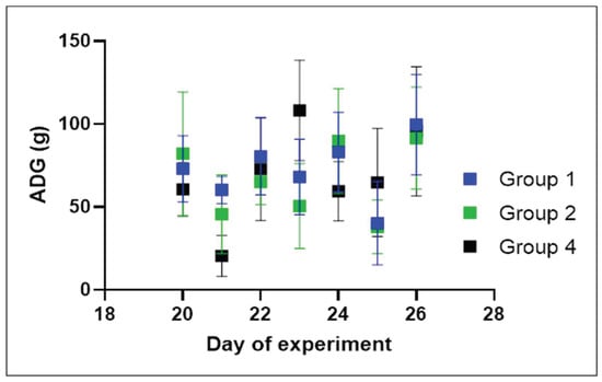 The average daily gain (ADG) of chicks in experimentally infected groups 1 (experimental dosage) and 2 (traditional dosage) versus control group 4 (no infection) was monitored during the experiment. Box and whiskers represent mean ± SD with n = 10 in each group.