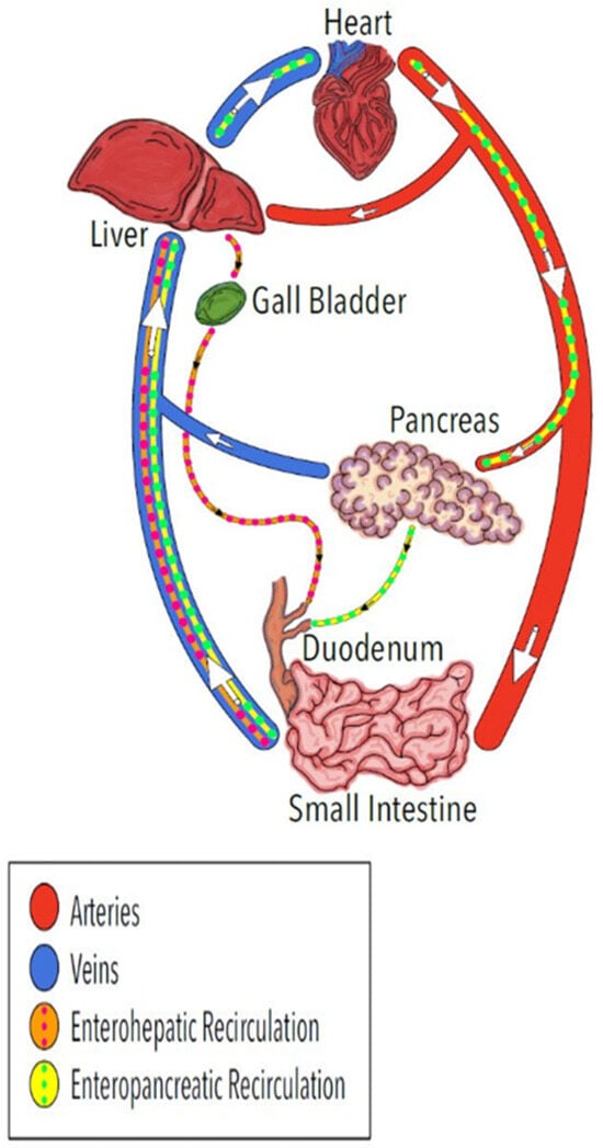 Illustration of the well-known enterohepatic recirculation pathway for bile acids and other molecules (orange) and the proposed enteropancreatic recirculation of some antibiotics and possibly other molecules (yellow). The arrows indicate direction of blood flow in the veins and arteries.