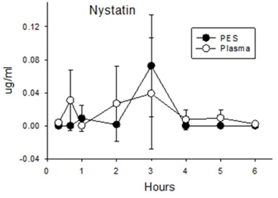 Concentrations of nystatin in plasma and PES after administration of 40 mg/kg (200,000 units/kg) directly into the duodenum.