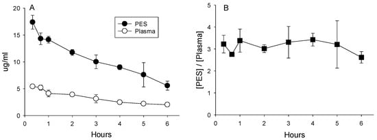 (A) Concentrations of metronidazole in plasma and PES after administration of 25 mg/kg directly into the duodenum. (B) Ratios calculated as the quotient of concentrations of metronidazole in the PES divided by plasma averaged 3.1 ± 0.5, indicative of concentrative secretion.