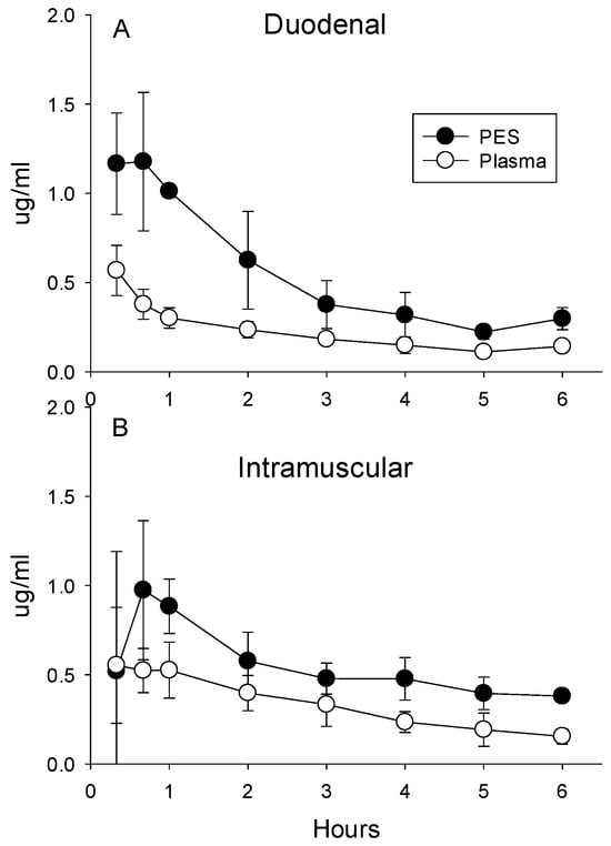 Enrofloxacin. Both routes of administration for enrofloxacin (duodenal and IM) increased concentrations in the plasma and PES (Figure 4A,B). Despite an IM dose that was 50% of the duodenal dose, plasma concentrations averaged 48% higher (±11% for all eight post-administration sampling times; p = 0.045) compared with administration into the duodenum. However, PES concentrations were not higher after IM administration compared with the duodenal dose (p = 0.63 for pooled data for all eight time points). Duodenal administration of enrofloxacin resulted in higher PES concentration during the first 2 h (Figure 4C). Over the entire 6 h collection period, ratios calculated from concentrations in PES relative to plasma averaged higher for the larger duodenal dose relative to intramuscular administration (2.32 ± 0.57 vs. 1.79 ± 0.53; p < 0.001).