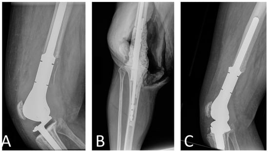 - Windhager, R.; Schreiner, M.; Staats, K.; Apprich, S. Megaprostheses in the treatment of periprosthetic fractures of the knee joint: Indication, technique, results and review of literature. Int. Orthop. 2016, 40, 935–943. [Google Scholar] [CrossRef] [PubMed]