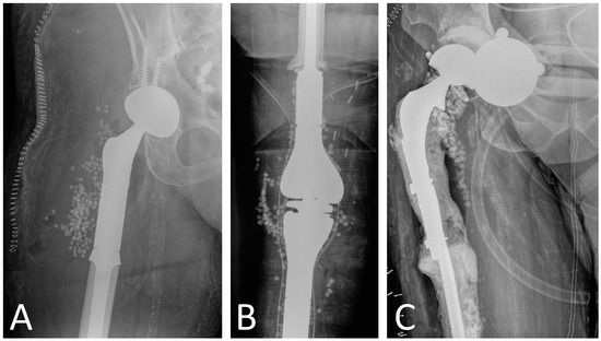 Use of calcium sulfate beads in megaprosthesis PJI as adjunct to surgical treatment in (A) proximal femur replacement, (B) distal femur replacement and proximal tibia replacement, and (C) proximal femur replacement. Patients in (A,B) underwent one-stage revision, while patient in Figure 2C had a two-stage revision.