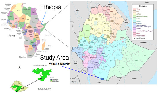 The study was conducted in selected villages in four districts (Yabello, Surupha, Dubuluk and Elweya) of the Borana zone, Oromia (Figure 1). These villages were selected based on their high milk production potential and ease of accessibility via cars. Borana zone is located in the lowlands of the Southern part of Oromia, Ethiopia. Yabello is the capital city of Borana zone and is about 570 km from Addis Ababa (Figure 1). The Borana pastoral area has a semi-arid to arid climate with dry and rainy seasons and bimodal rainfall distribution consisting of a long rainy season from March to May and a short rainy season from September to November. Despite usually expecting two rainy seasons, rainfall is increasingly becoming erratic and highly variable, resulting in frequent droughts and variability in livestock and livestock products off-take. The Borana community comprises both pastoral (those who only raise livestock) and agropastoral (those who grow some crops and also raise livestock) communities. Livestock production is a major source of livelihood for the community. Borana pastoralists historically raise only cattle; however, due to recent increasing erratic rainfall and drought problems, they have diversified their herds by additionally raising more drought-resilient livestock, including camels, goats and sheep [39]. The study area is typical of other pastoral settings where communities heavily depend on animal production usually raised comingled together or mixed species (cattle, sheep, goats and camels) [13,15]. People, domestic animals and wild animals share spaces and drinking water and live in close contact, which may favor the cross-species transmission of many infectious diseases, including the foodborne pathogens targeted in this study. Moreover, this study area is close to the border with Northern Kenya and Somalia and there is frequent cross-border contact between herders through grazing lands, livestock trade business as well as animal and human drugs smuggled across borders. Additional description of the study area is available elsewhere [13,15].