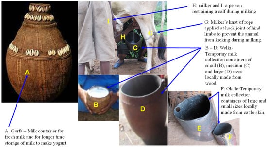 Locally made milk collection and storage containers. (A) Gorfa is a milk container that is handmade using traditional techniques. It is made from very tightly woven strands of vegetable or sisal fibers bunched together and wrapped at regular intervals with either one or two other fibers and decorated with cowry shells. Prior to use for milk storage, it is cleaned with water and smoked with glowing embers of local trees (Ejersa, scientific name Olea europaea subsp. cuspidate; Daanse, scientific name Faurea speciose; and Birreessa, scientific name Terminalia brownie) usually used for smoking milk containers [41]. The container is light and extremely durable and the inside has a black encrusted patina which makes it waterproof and ideal as a liquid container; (B–D) Welki is a temporary milk collection container locally made from wood and used when milking. It is available in different sizes, including small (B), medium (C) and large (D); (E,F) Okole is temporatry milk collection container locally made from skin of cattle and available in different sizes including large (E) and small (F); (G) a rope tied across both hind limbs at the hock joint using a milker’s knot to prevent the cow from kicking during milking; (H) a pastoralist woman kneel down on her leg and hold Welki (temporary milk collection container) tightly between her thighs and milking the cow quickly with both hands; (I) a person restraining the calf while the cow is milked. This picture was taken during study tim.