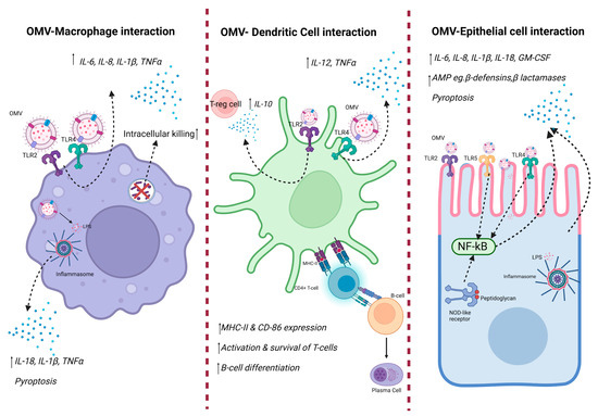 Live organisms have developed complex means to detect the invasion of external pathogens, including viruses, fungi, and bacteria. This process begins when immunological molecules, such as LPS, peptidoglycan, and flagellin, carried by OMVs, interact with the host’s receptors stimulating the immune response [23,46,47]. The initial detection of pathogens is led by germline-encoded pattern-recognition receptors (PRRs), which are responsible for recognizing pathogen-specific molecular signatures, also called pathogen-associated molecular patterns (PAMPs). Among the PPRs characterized to date are Toll-like receptors (TLRs), of which TLR1, 2, and 6 have been linked with the recognition of lipoproteins and peptidoglycans and TLR4 with LPS, while TLR3, 7, and 9 are related to binding nucleic acid sensors [48]. The binding of this complex is denominated as PRR-DAMPs/PAMPs and is involved in triggering immune responses and inflammation in the host [19]. Although this process is essential for pathogen elimination, uncontrolled inflammation can be detrimental, resulting in a double-edged sword by causing severe organ damage after the inflammation process [49]. Ultimately, OMVs couple the delivery of bacterial components and the generation of a highly pro-inflammatory environment in order to create a sustainable niche for bacteria to colonize and establish infection. As outlined in Figure 2, OMVs can activate multiple signaling pathways in macrophages, dendritic cells, and epithelial cells.