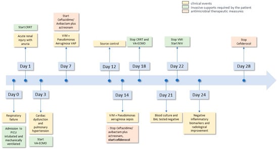 Cefiderocol is an injectable siderophore cephalosporin that binds to iron and uses a “Trojan horse” entry mechanism to penetrate into bacterial cells, overcoming the loss of porin channels and/or the overexpression of efflux pumps. This mechanism of action confers to cefiderocol’s high stability to Ambler classes of β-lactamases and carbapenemases including VIM [26]. Although it has not yet received approval from the EMA for pediatric use, two clinical trials [9,12] are currently ongoing in pediatric cohorts, proposing a dose of 60 mg/kg every 8 h for weight <34 kg and 2 g every 8 h for weight ≥34 kg through a 3 h extended infusion regimen. Considering that the patient described in this case report received both ECMO and CRRT support, dosage modifications were discussed by the clinician’s team. Sequestration of antibiotics in the circuit, increased volume of distribution (Vd), and decreased clearance (CL) are the major PK changes associated with ECMO support, particularly in children, since hemodilution caused by the priming solution is almost twice of patient’s blood volume [23]. Previous studies have shown that cefiderocol is not significantly adsorbed on the oxygenator membrane in the ECMO circuit; therefore, cefiderocol clearance is not expected to be altered in patients with ECMO support, despite the relatively high percentage of drug-free fractions [27]. Concerning the potential impact of the CRRT on the siderophore cephalosporine, previous studies have shown that cefiderocol could be highly removed by a dialysis hemofilter due to its high unbound fraction (50%) and low molecular weight (1000 Da) [28].