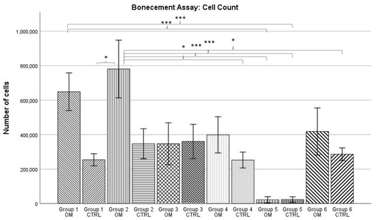 Mean cell count per group as established by DAPI cell count. The error bars show the error of mean. Bars connected by brackets are significantly different from one another. Stars indicate the level of significance: *** = p < 0.001; * = p ≤ 0.05. “OM” stands for osteogenic differentiation, “CTRL” for negative control.