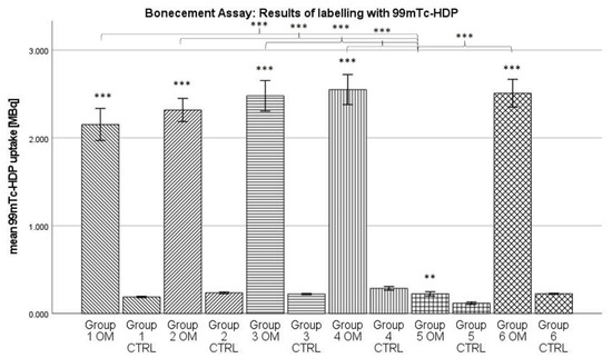 Mean 99mTc-HDP uptake. The error bars show the error of mean. Columns connected by brackets are significantly different from one another. Stars over Columns indicate the statistical difference between the osteogenic und control conditions of one group. Stars indicate the level of significance: *** = p < 0.001; ** = p < 0.01. “OM” stands for osteogenic differentiation, “CTRL” for negative control.