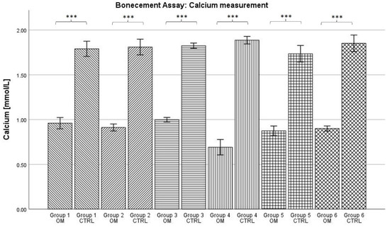 Mean concentration of calcium in cell culture medium per group. The error bars show the error of mean. Bars connected by brackets are significantly different from one another. Stars indicate the level of significance: *** = p < 0.001. “OM” stands for osteogenic differentiation, “CTRL” for negative control.