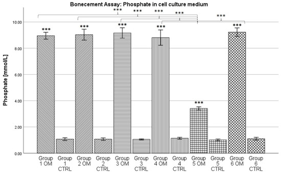 For all groups, the data showed normal distribution according to the Kolmogorov–Smirnov test. The ANOVA analysis revealed a statistically significant difference between the osteogenic condition and its corresponding control condition for every group (p < 0.001). Furthermore, the phosphate concentration in the medium of the osteogenic condition of group 5 was significantly lower than the concentration for the osteogenic conditions of all other groups (p < 0.001).