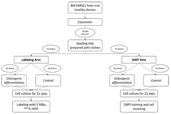 - Hofmann, J.; Borcherding, K.; Thiel, K.; Lingner, T.; Sommer, U.; Haberkorn, U.; Bewersdorf, T.N.; Schmidmaier, G.; Grossner, T. (99m)Tc-HDP Labeling—A Non-Destructive Method for Real-Time Surveillance of the Osteogenic Differentiation Potential of hMSC during Ongoing Cell Cultures. Int. J. Mol. Sci. 2022, 23, 15874. [Google Scholar] [CrossRef] [PubMed]