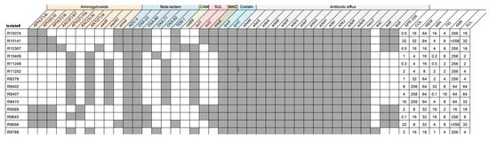 A total of 30 A. baumannii clinical isolates were included in the study; the isolates were representative of different geographical areas including Thailand, Israel, Taiwan, Michigan, and California. A portion (14/30) (46%) of the isolates were collected from patients who were enrolled in an NIH-funded clinical trial evaluating the treatment outcomes of extremely drug-resistant Gram-negative pathogen infections [34]. A total of 28/30 of the isolates were CRAB, indicated through the meropenem (MEM) MIC of ≥8 mg/L, and 15/30 were COL-resistant, indicated through the colistin (COL) MIC OF ≥4 mg/L [35]. To further present resistance mechanisms, genomic sequencing analyses were completed on 14 A. baumannii isolates, all of them being COL-resistant and CRAB isolates.