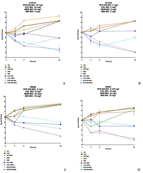 Time-kill analyses (TKAs) were performed against four isolates (CRAB and COL-resistant) in Mueller–Hinton broth (MHB) as growth media and each TKA was performed in duplicate for all antibiotic regimens to ensure reproducibility. In the TKA against the four A. baumannii isolates, each well was treated without a drug, SPR206, COL, MEM, MIN, SPR206 + MEM, SPR206 + MIN, COL + MEM, and COL + MIN, at a concentration of 0.5× MIC or the biological free peak (MEM fCmax at 30 mg/L per 1 g q 8 h dosing, COL fCmax at 2 mg/L per 4.5 million IU q 12 h dosing, and MIN fCmax at 8 mg/L per 200 mg IV q 12 h dosing), utilizing whichever was lower [32,46,47]. The experiments were conducted at a starting inoculum of ~1 × 106 for each isolate and were conducted in a shaker incubator at 37 °C for 24 h and aliquots of 0.1 mL were obtained from each well at the 0-, 4-, 8-, and 24-h time intervals.
