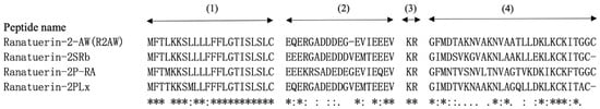 2.1. “Shotgun” Cloning of R2AW from Amolops Wuyiensis Skin Secretion-Derived cDNA Library