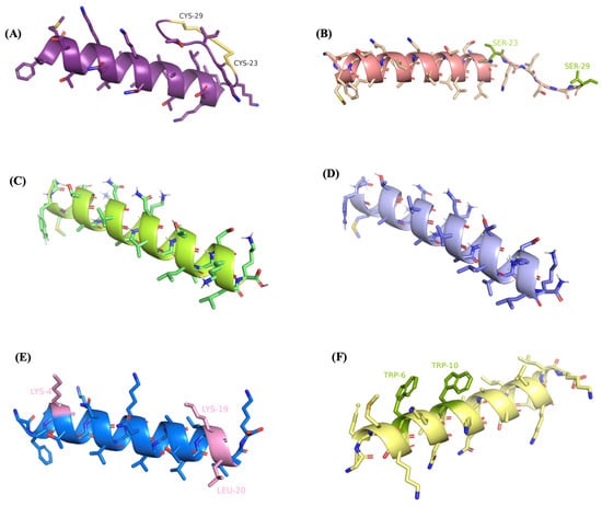 - Chen, Y.; Guarnieri, M.T.; Vasil, A.I.; Vasil, M.L.; Mant, C.T.; Hodges, R.S. Role of peptide hydrophobicity in the mechanism of action of α-helical antimicrobial peptides. Antimicrob. Agents Chemother. 2007, 51, 1398–1406. [Google Scholar] [CrossRef] [PubMed]