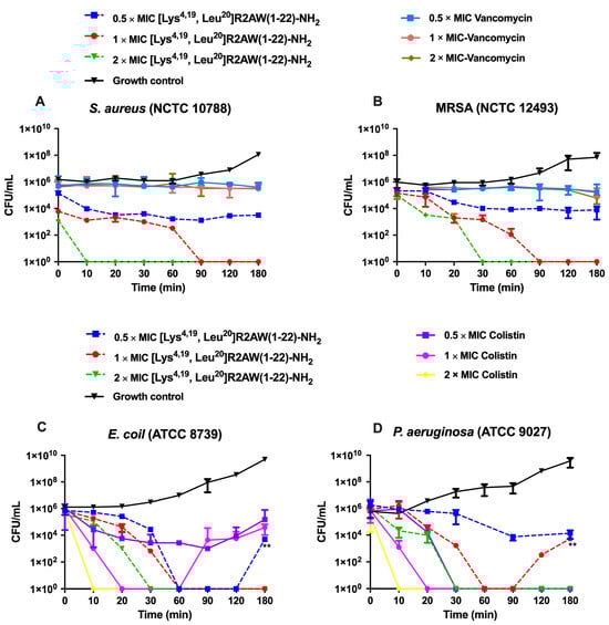 2.6. Killing Kinetics against S. aureus, E. coli, MRSA, and P. aeruginosa by [Lys4,19, Leu20]R2AW(1-22)-NH2